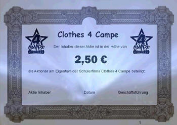 garantiert werden.Der Direktor der Realschule Camper Höhe Herr von Loh kaufte in der Gesamtkonferenz im Anschluss an die Präsentation die erste Aktie im Wert von 2,50 Euro, somit ist er einer von hoffentlich zahlreichen Aktionären. Einmal im Jahr wird die Schülerfirma alle Aktionäre zu einer Hauptversammlung einladen. Hier wird auf das zurückliegende Geschäftsjahr geblickt und die einzelnen Abteilungen berichten über ihre Arbeit. Weiterhin gibt die Firma „Clothes 4 Campe“ eine Prognose für das kommende Jahr ab und stellt zukünftige Pläne vor.