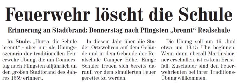 Die angekündigte Feuerwehrübung am 16.06.2011 findet nicht an der RS Campe sondern an der Friedrich-Fröbel Schule nebenan statt.