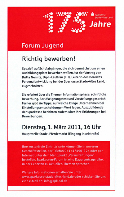 01.03.2011: „Richtig bewerben“ Dipl-Kauffrau Britta Nemitz referiert um 16 Uhr in der Hauptstelle der SSK Stade am Pferdemarkt über die Themen Vorstellungsgespräch, Tests sowie schriftliche Bewerbung. Worauf legen Unternehmen Wert? Auszubildende der Sparkasse berichten über ihre Erfahrungen bei der Bewerbung. Ihre kostenlose Eintrittskarte können Sie in den Geschäftsstellen, per Telefon (04141/490-224) oder per Internet unter folgenden Link bestellen: