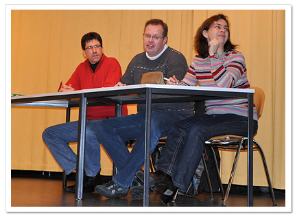 Zu Beginn der dritten Stunde sammelten sich die sechsten Klassen in der Aula und die Jury, bestehend aus Frau Saljé, Herrn Vogel und dem Schulleiter Herrn von Loh, machte sich bereit, die Vorlesenden zu bewerten. Die Schüler Zoe, Nuray, Milena, Jenny, Büsra und Jannick betraten nacheinander die Bühne und waren aufgefordert, zunächst aus einem Wunschtext und im Anschluss aus einem unbekannten Text vorzulesen.