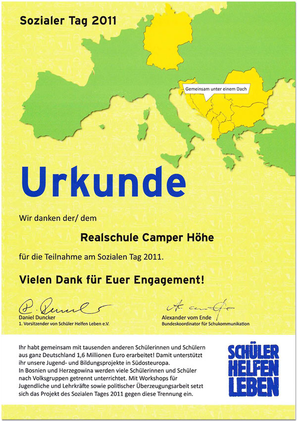 Für die Teilnahme am Sozialen Tag 2011 erhielten wir eine Urkunde.