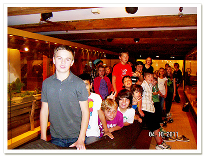 „verwandeln“. Ayline schlüpfte in die Toga einer Senatorin, Nico verkleidete sich zum stattlichen germanischen Krieger und Andreas trug schwer am Kettenhemd eines römischen Legionärs. Die Schüler/innen waren begeistert über diesen anschaulichen Geschichtsunterricht. Zum Schluss konnten alle in kleinen Gruppen an verschiedenen Stationen das damalige Leben kennenlernen. Sei es Armbrustschießen, was besonders den Jungen gefiel, oder das Nussspiel, bei dem man seine Geschicklichkeit beweisen musste. Auch ein germanisches Langhaus sollte sinnvoll eingerichtet werden. Alle waren sich einig: das war ein gelungener Ausflug in die Vergangenheit. |