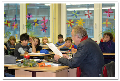 einer vorweihnachtlichen Lesung in die Klassen 5c und 5d. Die Lesung war sehr kurzweilig und interessant, was nicht zuletzt an der Auswahl seiner Geschichten und seiner offenen und freundlichen Art lag, mit der er auf die SchülerInnen einging. Für die SchülerInnen war es sehr spannend, einen leibhaftigen Schauspieler so hautnah zu erleben, der zudem auch noch Tipps gab, wie man längere Texte sicher auswendig lernen kann. Mit dieser Veranstaltung ist es uns gelungen, etwas Ruhe in den vorweihnachtlichen Trubel in der Schule zu bringen und die Wartezeit bis zum Beginn der Weihnachtsferien angenehm zu verkürzen! Barbara Schwerdtner und Silke Tiemann |