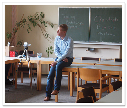 Am Donnerstag, dem 5. Juli 2012 besuchte Herr Pietsch von der IKK die Klassen 9c und 9d. Er bereitete uns auf Vorstellungsgespräche vor und erklärte uns das perfekte Verhalten bei einem Gespräch mit dem „zukünftigen“ Arbeitgeber. Dazu wurden einige Vorstellungsgespräche von Freiwilligen aus der Klasse aufgenommen und anschließend den anderen aus der Klasse vorgespielt und von ihnen bewertet. Anschließend bekamen wir einige Broschüren, in denen wir Tipps für die Berufsorientierung, die Jobsuche, die Bewerbung und ein Vorstellungsgespräch nachlesen können. Der Besuch von Herrn Pietsch hat uns viel Wissenswertes über Vorstellungsgespräche vermittelt und wir haben alle dazugelernt.