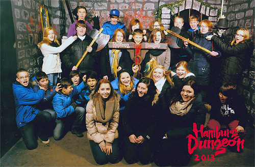mit allen Schülern mit der S-Bahn dorthin. Beim Ankommen haben sich alle versammelt und gewartet bis sie ins Dungeon hineingehen durften. Nachdem alle eintreten konnten, wurde ein Klassenfoto geschossen. Als das Foto geschossen war, begann der Rundgang. In jedem Raum war eine sogenannte „Kreatur“, die die Klasse geführt hat. Es wurde viel von der damaligen Lebenssituation in Hamburg erzählt. Im Dungeon gab es viele spaßige, aber auch gruselige, Räume wie z.B. ein Spiegellabyrinth oder eine kleine Wasserbahn. Als die Führung endete, durften alle Schüler noch eine Weile im Dungeon-Shop bleiben und sich etwas kaufen, bis es mit der S-Bahn zurück nach Stade ging. Letztendlich hat es jedem gefallen. Das Hamburg Dungeon ist