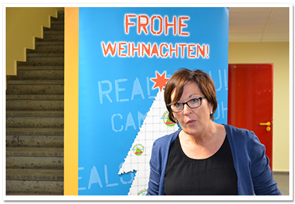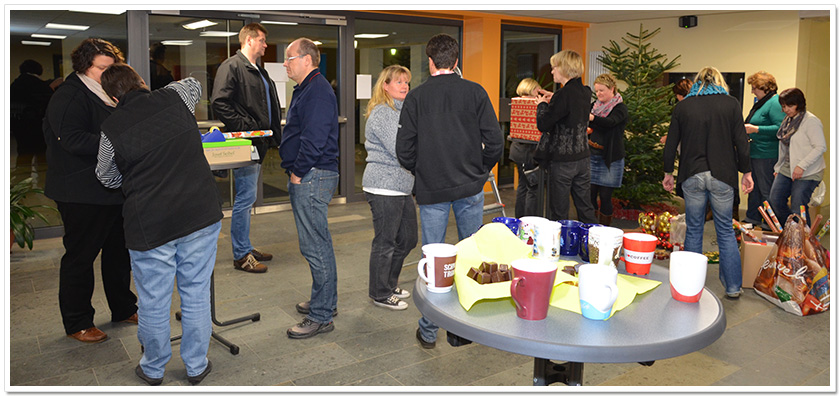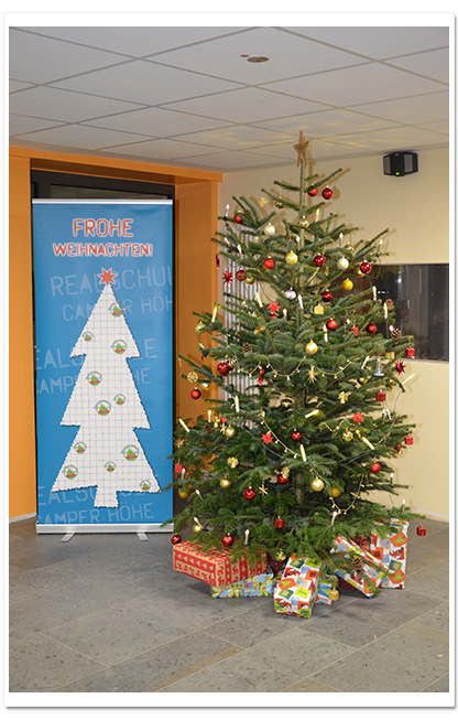 | Das werden sich viele Schülerinnen und Schüler gefragt haben, als sie am Montag in das Schulgebäude kamen. Im Eingangsbereich steht jetzt ein geschmückter Tannenbaum, der in dieser dunklen und kalten Jahreszeit weihnachtliche Gefühle vermitteln soll. |