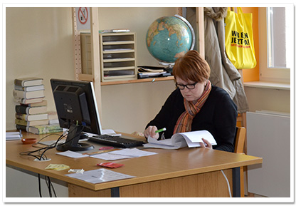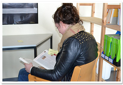 Die Bücherei befindet sich im 2. Stock des A-Traktes und wird jeden Tag in den großen Pausen von unserer neuen Bibliothekarin Frau Meincke betreut. In dem großen, hellen Raum befinden sich jeweils zwei große Konferenztische, die vom Schulförderverein gesponsert wurden, eine gemütliche Ecke zum Lesen und viele neue Bücher. Außerdem verfügt unsere Bücherei auch über ein Antiquariat. Das heißt, dass sie auch auf alte und gebrauchte Bücher spezialisiert ist. Anschaffungswünsche können jederzeit bei Frau Meincke geäußert werden.