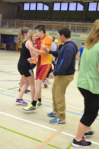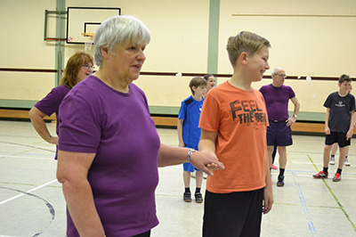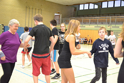 getroffen. Gemeinsam sollte der Volkstanz „Phrase Craze“ getanzt werden. Die Anspannung der beiden Generationsgruppen war deutlich spürbar. Die anfänglichen Zweifel („Wollen die überhaupt mit uns tanzen?“) waren schnell verflogen. Eine Mischung aus Konzentration, Spaß und Taktgefühl brachten schnell eine mitreißende Stimmung. Beide Gruppen forderten zum Abschied die Wiederholung im nächsten Jahr. |