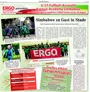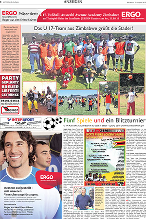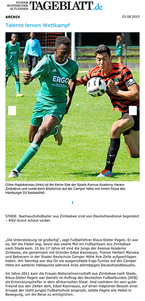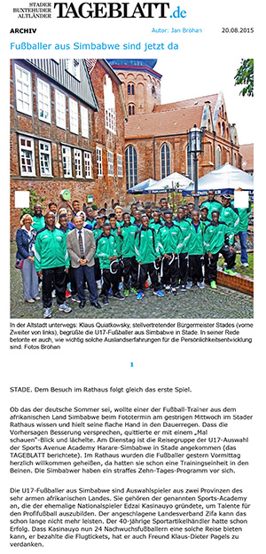 Das Fußball-Trainingslager mit jungen Spielern aus Simbabwe fand vom 18. - 28.08.2015 statt. Neben Trainingseinheiten auf dem Güldensternplatz und Spielen gegen heimische Mannschaften erkundeten die Gäste auch die nähere Umgebung. Der Besuch rief ein großes Echo in den lokalen Medien hervor.