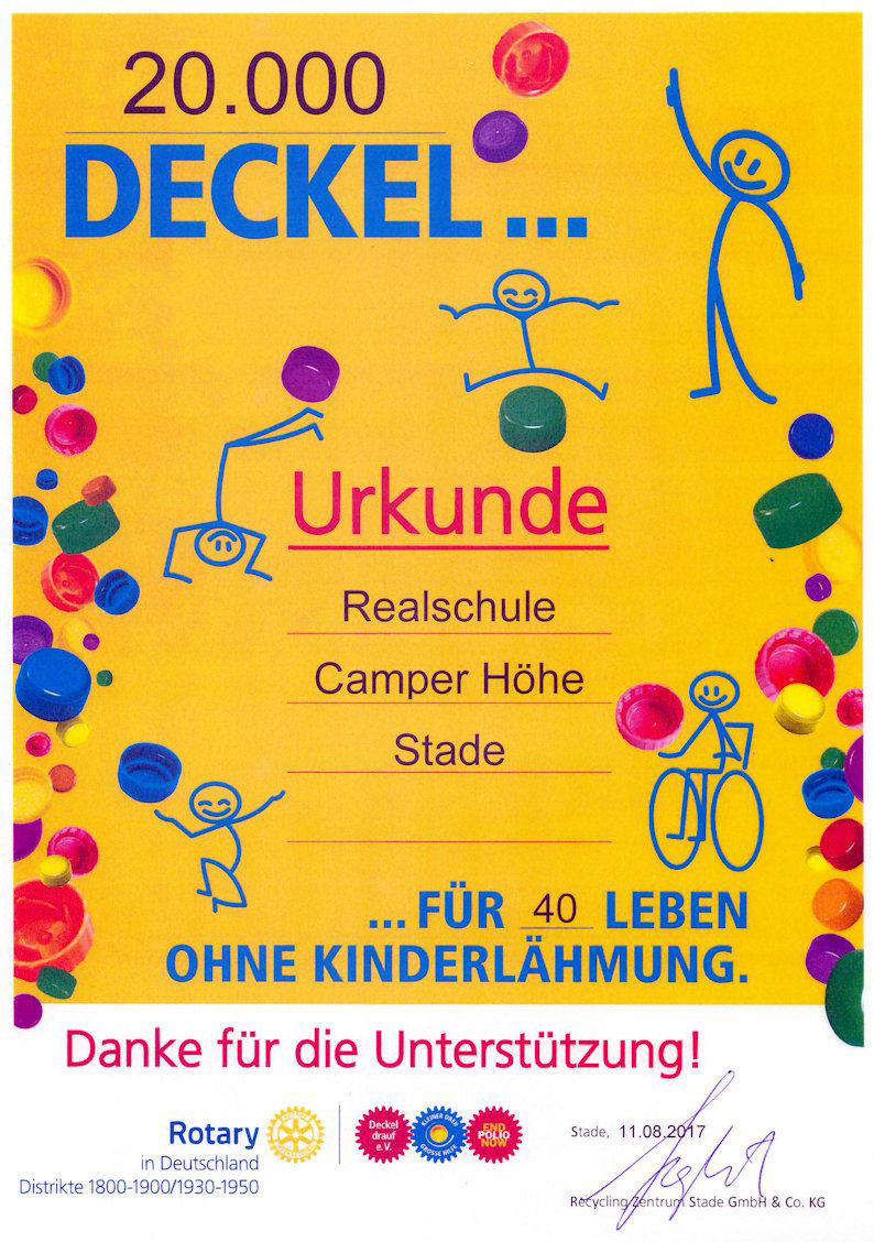 Auf Initiative des Schülers Björn Henning wurde im letzten Schuljahr die Sammelaktion von Getränkedeckeln bei uns an der Realschule Camper Höhe ins Leben gerufen. In den Sommerferien wurden 20.000 Deckel übergeben, wofür 40 Impfungen durchgeführt werden können. Ein toller Erfolg. Wir führen diese Aktion in diesem Schuljahr weiter und hoffen auf weitere Deckel, um die Zahl der Impfungen noch deutlich erhöhen zu können.