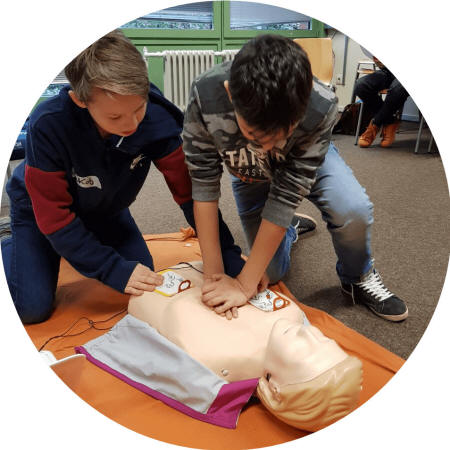 Jahr wieder im Jahrgang 7 Auch in diesem Jahr ließen sich die Schüler/innen aller siebten Klassen in den Bann der Notfalltrainer Moritz Mutzmann und Julian Tejeda von dem Verein „Ich kann Leben retten! e.V.“ ziehen. Am Dienstag, den 19.11.2019 konnten wir bereits zum dritten Mal in Folge den Verein „Ich kann Leben retten e.V. „aus Hamburg für den siebten Jahrgang engagieren. Interaktiv wurden mit den Kindern die Basics der lebensrettenden Sofortmaßnahmen theoretisch, anschaulich erarbeitet und praktisch ausprobiert. Das Fazit des jeweils 90-minütigen Kurses war, dass man nichts falsch machen kann, denn nur nichts tun ist falsch. Leben retten ist „kinderleicht“ – „prüfen, rufen, drücken“ und jeder kann es. Oft schüren Ängste und unzureichendes Wissen im Bereich der ersten Hilfe den Mut in Notfallsituationen zu handeln und verleiten dazu wegzuschauen. Die Notfalltrainer appellierten, dass blitzschnelles Handeln viele Leben retten kann. Ein Mensch kann bis zu drei Minuten ohne Sauerstoff auskommen ohne, dass das Gehirn schwere Schäden nimmt, jedoch kommt ein Rettungswagen oder Notarzt meist nicht innerhalb der ersten drei Minuten, sodass man auf die Hilfe der Bürger angewiesen ist. Die Notfalltrainer vermittelten das notwendige Wissen, bestärken, mutig Menschen sofort zu helfen, einzugreifen, wenn beispielsweise das Herz versagt. Denn jeder kann Leben retten. Die wichtigsten Handgriffe wurden leicht verständlich von den Notfalltrainern gezeigt und erklärt. Und dann hatten die Schüler/innen die Chance selbst zu üben, um im Notfall zu handeln. Im Fokus stand, wie man einer bewusstlosen Person hilft, wieder atmen zu können. An dieser Stelle sagen wir Moritz Mutzmann und Julian