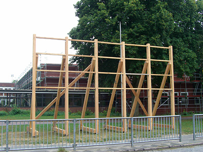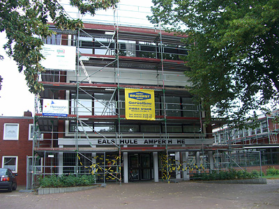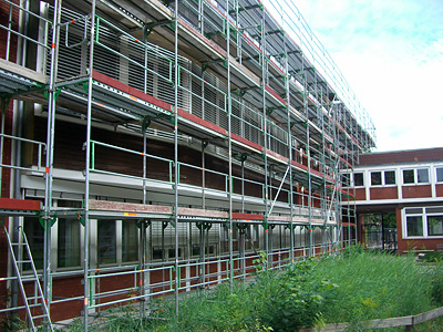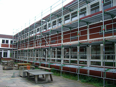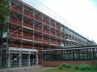 In den nächsten Jahren wir die Realschule Camper Höhe grundsaniert – die aufgebauten Gerüste sind erst der Anfang.