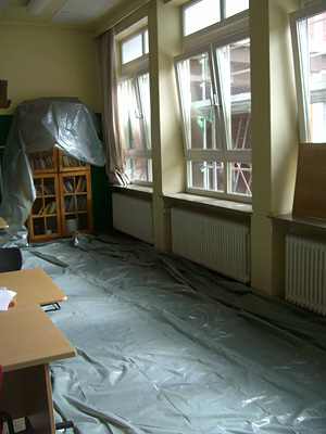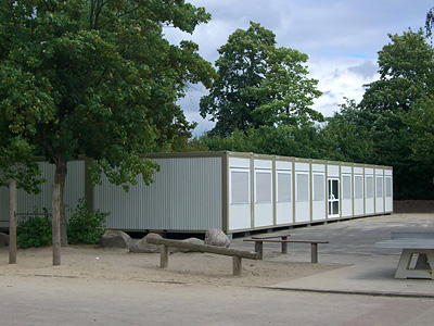 Da auch am Atheneum gearbeitet wird, werden zusätzliche Schülerinnen und Schüler auf dem Gelände der Realschule Camper Höhe beschult –Container für vier zusätzliche Klassenräume wurden auf dem Schulhof aufgestellt