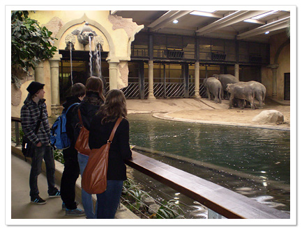 Frau Smiglewicz kaufte die Eintrittskarten, während wir uns für ein Gruppenfoto vor dem Haupteingang in Stellung brachten. Nachdem wir sicherheitshalber gleich zweimal abgelichtet wurden, konnten wir uns auf die verschlungenen Wege des seit 1896 bestehenden Tierparks machen.