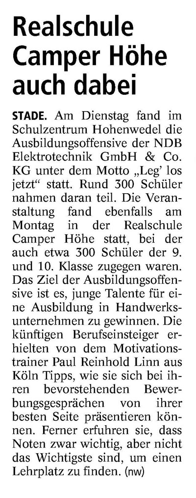 Das Fazit seines kurzweiligen Vortrags lautete: „Leg los, Jetzt!“ - Ein Appell an die Schülerinnen und Schüler, ihre berufliche Zukunft zu planen, Verantwortung zu übernehmen und sich der eigenen Fähigkeiten und Stärken bewusst zu werden. Am 13.12.2011 kamen auch die Schüler des Schulzentrums Hohenwedel in den Genuss eines Powertags (siehe unten: Stader Tageblatt vom 14.12.2011) |