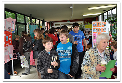die Ergebnisse ihrer Projekttage der Öffentlichkeit vorzuführen. In der Zeit von 15:00 bis 18:00 Uhr hatten sich die Flure der RS Camper Höhe mit interessierten Eltern gefüllt, Sie konnten sich ebenso über Segeln, Kulturen der Welt, Elefanten wie auch über die Welt der Wirbellosen, Spiel und Tanz oder Flugzeugbau informieren. An der Cafeteria hatten sie dann die Möglichkeit, bei Kaffee und Kuchen zu entspannen und die Informationen zu verarbeiten. Hier ein paar Eindrücke des Tages: |