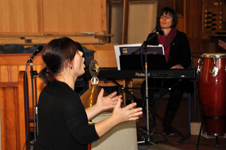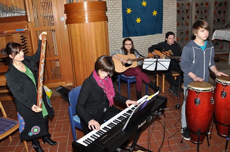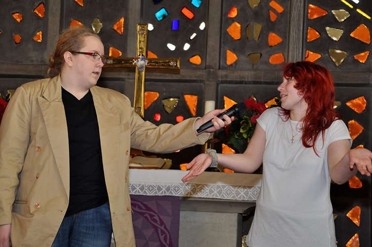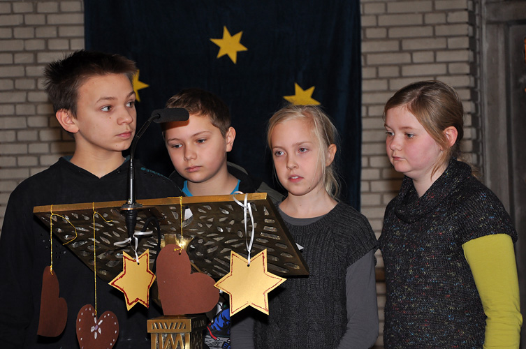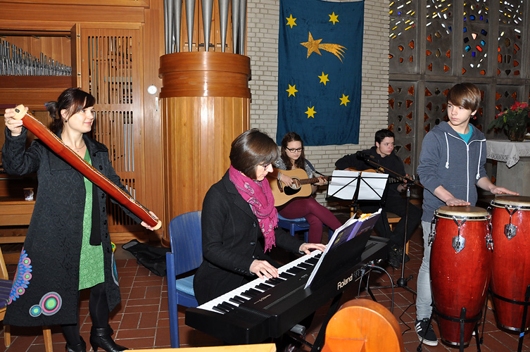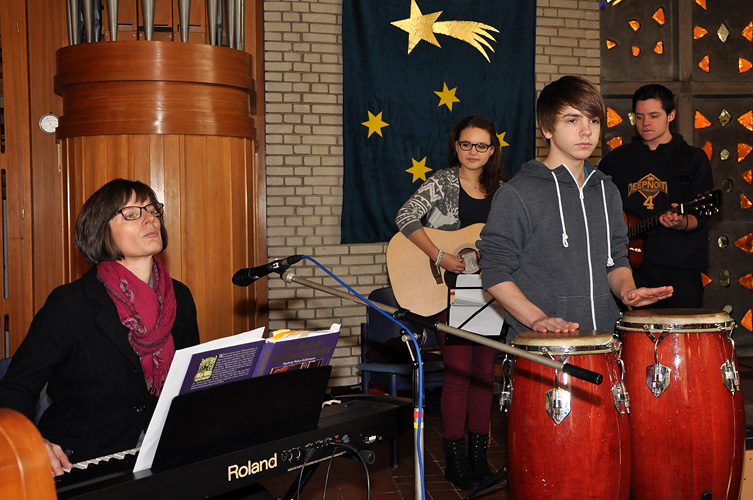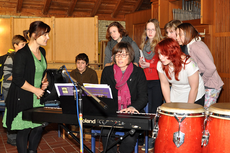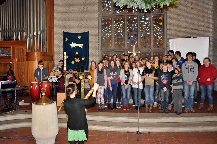 Die Akteure zeigten in spielerischen Szenen wie Jugendlichen, zum Beispiel bei Streitigkeiten oder bei Mutproben um zur Clique zu gehören, durch "Engel" Entschlusskraft und Selbstvertrauen vermittelt wird damit sie ihren eigenen Weg gehen können. "Engel brauchen keine Flügel - sie sehen aus wie normale Menschen und sind überall unter uns ..." so das Fazit der Aufführung: "Interview mit einem Engel". Alle Schülerinnen und Schüler waren mit großer Begeisterung bei der Generalprobe dabei. Und als dann, dirigiert von Frau Müller-Trudgett und begleitet von Frau Tiemann und der Band, das Lied "Avec les anges" erklang, war schon ein bisschen Weihnachtsstimmung in der Johanniskirche zu spüren.,