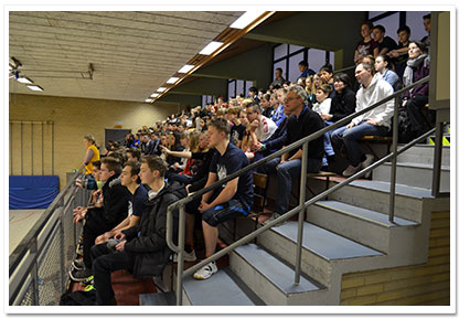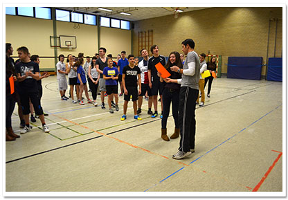 Schülern der Klassen 5 bis 10 schon heiß erwartet wurde. Die Klassen wurden in zwei Gruppen aufgeteilt und konnten sich in den verschiedensten Sportarten messen. Die Klassen 5 und 6 traten im Völkerball gegeneinander an, die Klassen 7 und 8 kämpften um den Sieg im Fußball bzw. Floorball und die Klassen 9 und 10 bemühten sich um das Erreichen des Finals im Volleyball am nächsten Tag. Als Highlight durften die Sieger der Klassen 10 nach dem Endspiel ein weiteres Spiel gegen die Lehrer bestreiten. Auf den Tribünen tummelten sich jede Menge Schüler jeglicher Klassenstufen, die ihre Teams anfeuerten. Leider unterlagen die Schüler der 10b im Endspiel den Lehrern klar, doch konnte auch das die gute Stimmung nicht dämpfen. Bei so einem tollen Ablauf kann man sich schon aufs nächste Jahr freuen!