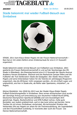 Das Fußball-Trainingslager mit jungen Spielern aus Simbabwe fand vom 18. - 28.08.2015 statt. Neben Trainingseinheiten auf dem Güldensternplatz und Spielen gegen heimische Mannschaften erkundeten die Gäste auch die nähere Umgebung. Der Besuch rief ein großes Echo in den lokalen Medien hervor.