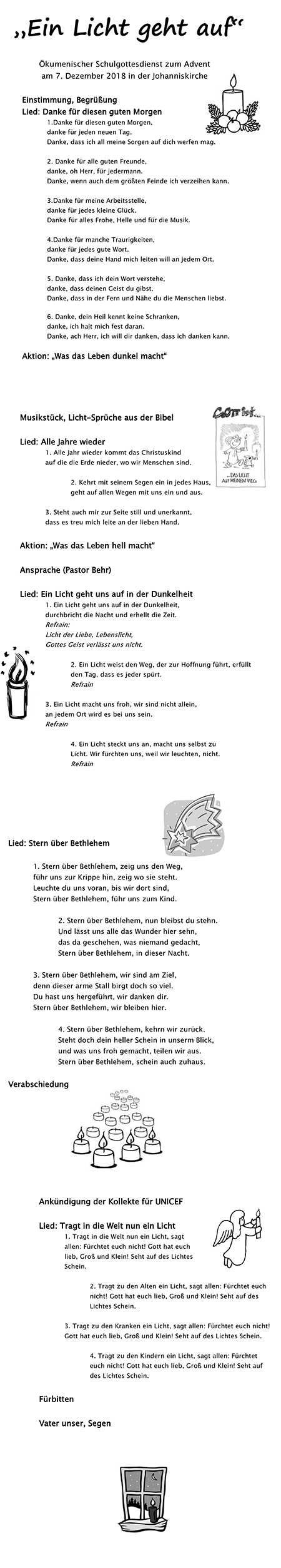gefeiert werden. In diesem Jahr wurde am 07.12.2018 ein Gottesdienst mit den Schülerinnen und Schülern der 5.-7. Klassen zum Thema: „Ein Licht geht auf!“ gefeiert. Zur Vorbereitung haben sich die Schülerinnen und Schüler in ihren Religions- bzw. Werte und Normenkursen Gedanken darüber gemacht, was das Leben hell bzw. dunkel macht, haben Lichtsprüche in der Bibel gesucht und entschieden, dass sie auch für andere Menschen ein Licht sein wollen, weshalb die Kollekte für UNICEF gesammelt wurde. So wurde es ein Gottesdienst von den Schülern für die Schüler.