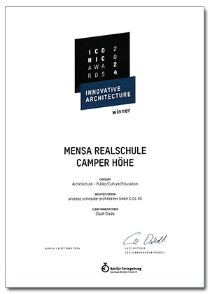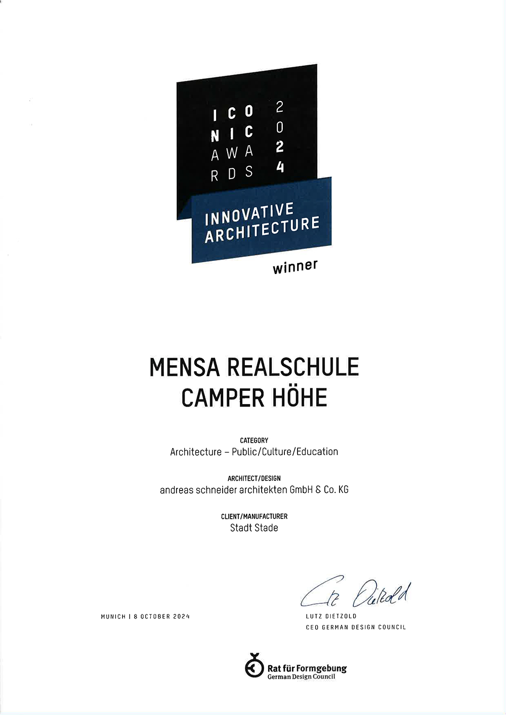 Diese bedeutende Auszeichnung erhielt das Architekturbüro Andreas Schneider Architekten Bremen/Hamburg für den Mensaneubau an der Realschule Camper Höhe.