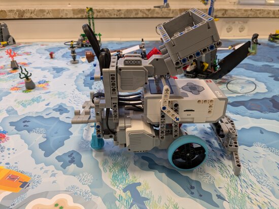 Wir haben einen Legotechnikroboter gebaut (Robotdesign), der möglichst viele Punkte beim Lösen von Aufgaben einer Unterwasserwelt im Ozean schaffen sollte (Robot Game).
